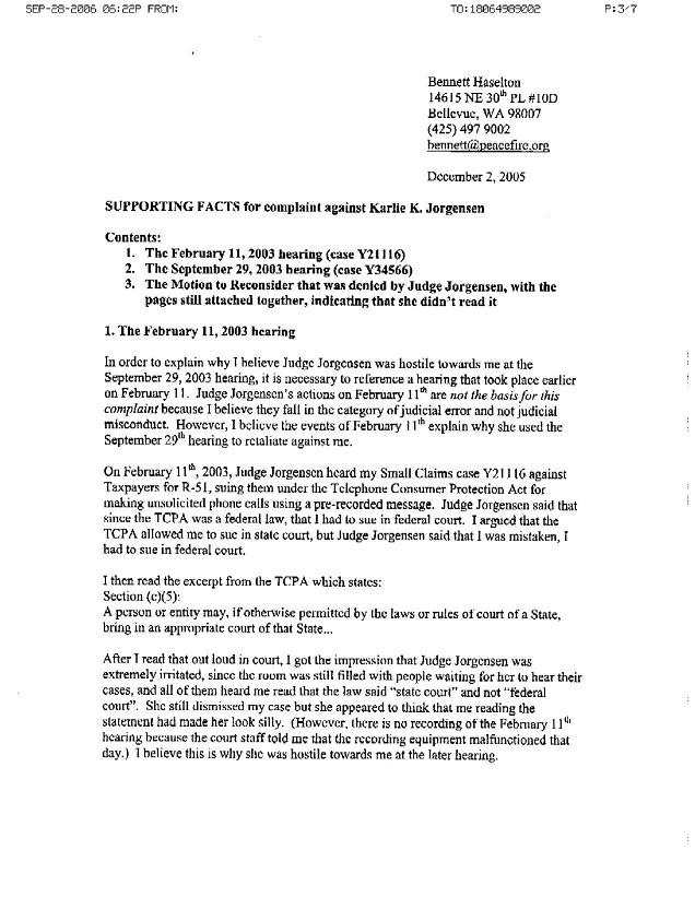 Below is a full copy of the complaint that I filed against Judge Karlie Jorgensen with the Washington Commission on Judicial Conduct.